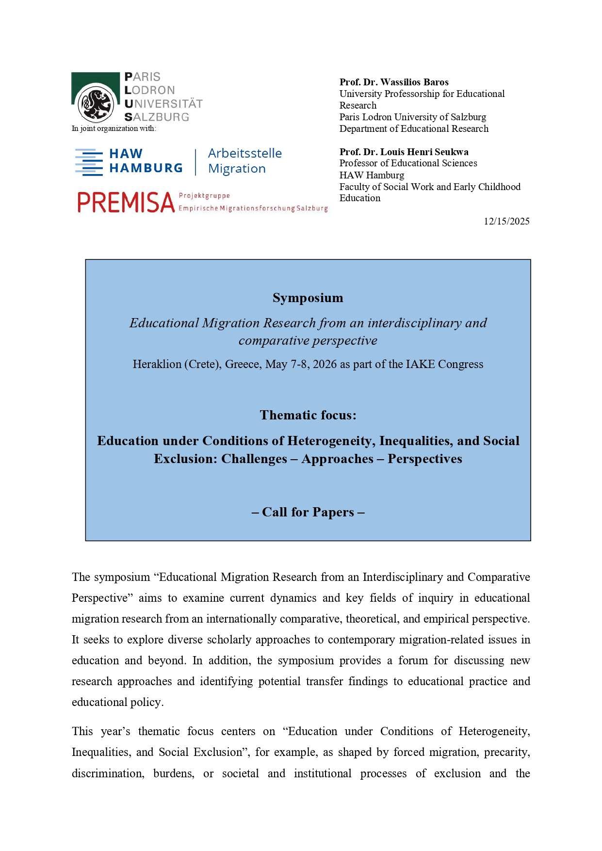 Symposium Educational Migration Research 2025 Symposium Educational Migration Research from an interdisciplinary and comparative perspectiveHeraklion (Crete), Greece, May 8-9, 2025 as...