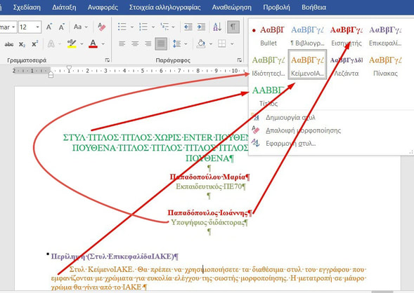 Στην περίπτωση που η εργασία έχει συντεθεί αρχικά εκτός του προτύπου του ΙΑΚΕ, τότε, πριν την υποβολή της, θα πρέπει να γίνει αντιγραφή μέσα στο πρότυπο και διαδοχική αντιστοίχιση των στοιχείων της με τα κατάλληλα στυλ, όπως φαίνεται στην παρακάτω εικόνα. (αν πχ επιλεγεί ο τίτλος της εργασίας και μετά το στυλ "Τίτλος", τότε γίνεται αυτόματα η αντιστοίχιση του στυλ και ο τίτλος εμφανίζεται πράσινος. Αν επιλεγεί μια λεζάντα εικόνας και μετά το στυλ "Λεζάντα" τότε αυτή εμφανίζεται με την κατάλληλη γραμματοσειρά, στοιχισμένη στο κέντρο κλπ. Αν, παρόμοια, επιλεγεί μία επικεφαλίδα, τότε αυτή μορφοποιείται αυτόματα, με τις κατάλληλες αποστάσεις πάνω και κάτω, ώστε να μην χρειάζονται επιπλέον κενά, enter κλπ).