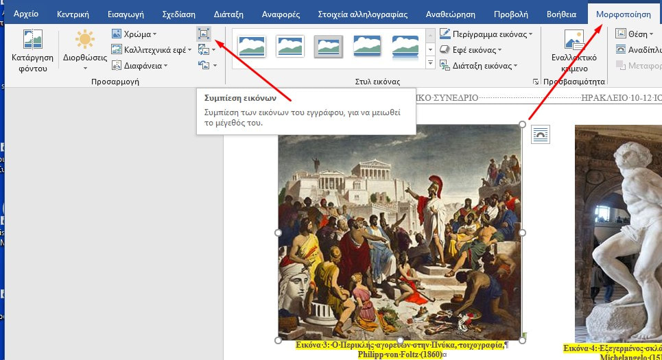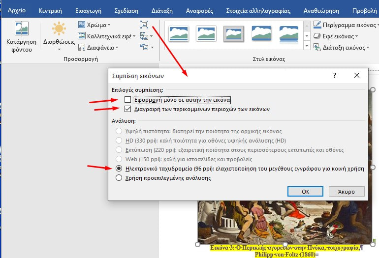 Αν υπάρξει πρόβλημα, επικοινωνείτε με τον υπεύθυνο. Το επιτρεπόμενο μέγεθος των 2 Mb είναι σχεδόν πάντα επαρκές. Αν η εργασία είναι μεγαλύτερη, τότε περιλαμβάνει πολλές εικόνες. Θα πρέπει αυτές να συμπιεστούν, με επιλογή μίας από τις εικόνες και στη συνέχεια, από το μενού Μορφοποίηση, επιλογή του εικονιδίου Συμπίεση εικόνων, θα συμπιεστούν όλες στα 96ppi. Οι αντίστοιχες επιλογές δείχνονται από τα βέλη (πατήστε για μεγέθυνση).